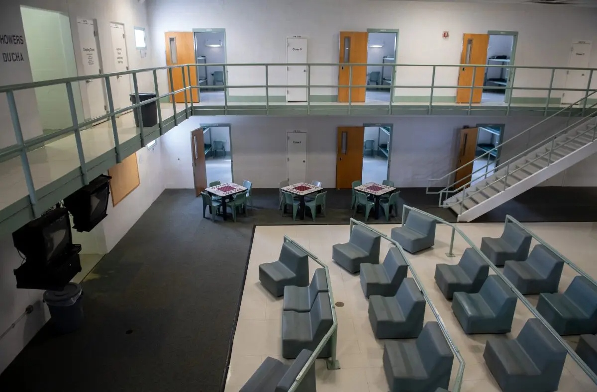 Una zona común y las puertas de las celdas del centro de detención Caroline en Bowling Green, Virginia, el 13 de agosto de 2018. El centro, una antigua cárcel regional, ha sido contratado por el Servicio de Inmigración y Control de Aduanas para albergar a inmigrantes ilegales detenidos. (Foto de Saul Loeb/AFP/Getty Images)Los senadores dijeron que el gran tamaño de las instalaciones previstas, el breve plazo para su apertura y la supuesta falta de transparencia suscitan dudas sobre si los proyectos se han planificado y revisado adecuadamente en cuanto a su impacto medioambiental.