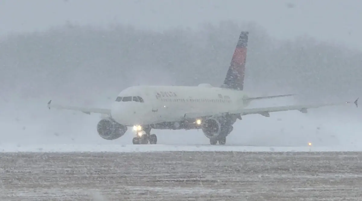 En esta captura de pantalla obtenida de un video de redes sociales, un avión de Delta Air Lines se prepara para despegar durante una tormenta invernal en el Aeropuerto Internacional Greater Rochester en Rochester, Nueva York, el 26 de diciembre de 2025. (Joseph Frascati vía Reuters)Vuelos cancelados, eventos interrumpidos