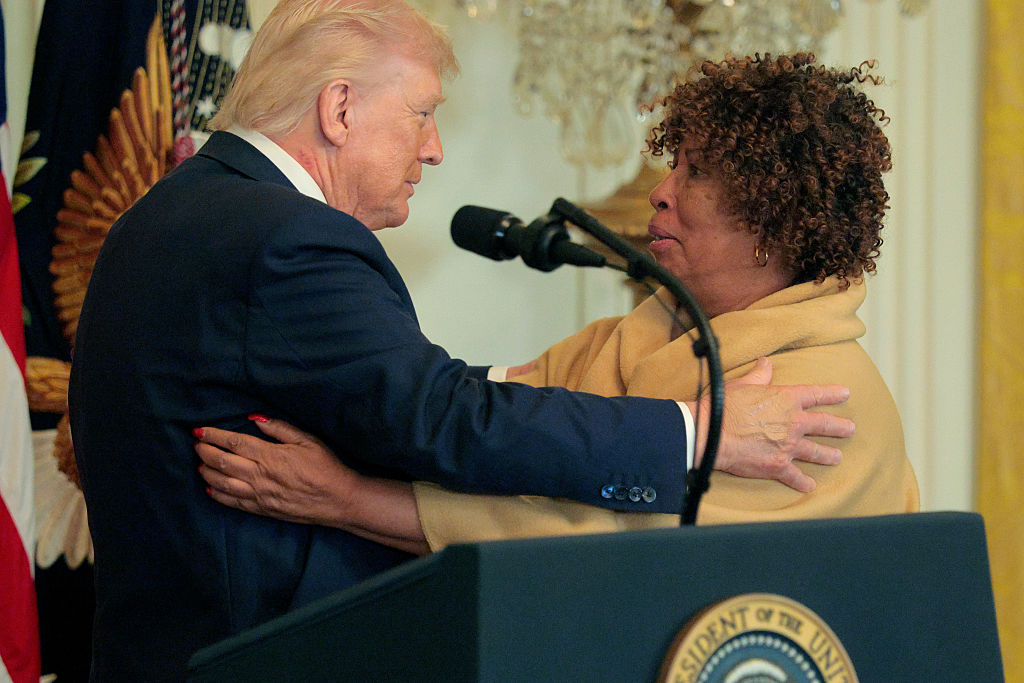 El presidente de los Estados Unidos, Donald Trump, abraza a Felicia Cook, residente en Washington D. C., que perdió a su nieto a causa de la violencia armada, durante una recepción con motivo del Mes de la Historia Afroamericana celebrada en el Salón Este de la Casa Blanca el 18 de febrero de 2026 en Washington D. C. (Chip Somodevilla/Getty Images)"Lo quiero , y no quiero oír nada de lo que tengas que decir sobre el racismo, y no me veas en las noticias odiándome porque estoy defendiendo a alguien que merece ser defendido. Aléjate de él, y la abuela lo dijo".