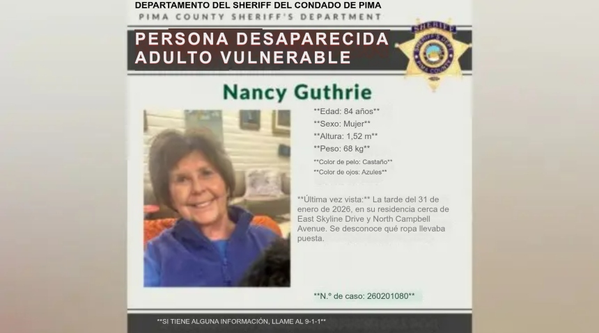 Nancy Guthrie fue vista por última vez el sábado por la noche en su casa de Catalina Foothills, cerca de Tucson, donde vivía sola. Su desaparición se denunció el domingo. Alguien de una iglesia llamó a un familiar para decirle que Guthrie no estaba allí, lo que llevó a los familiares a registrar su casa y luego llamar al 911, dijo Nanos.
