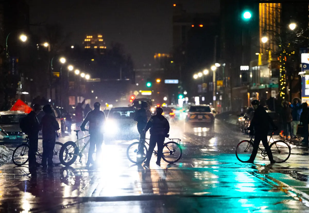 Manifestantes que protestan contra las operaciones del Servicio de Inmigración y Control de Aduanas (ICE) bloquean el tráfico con bicicletas en Minneapolis el 8 de enero de 2026. (John Fredricks/The Epoch Times).The Epoch Times no vio a ningún oficial de policía ni cinta de escena del crimen en las manzanas cercanas al lugar del tiroteo el jueves por la tarde y la noche.