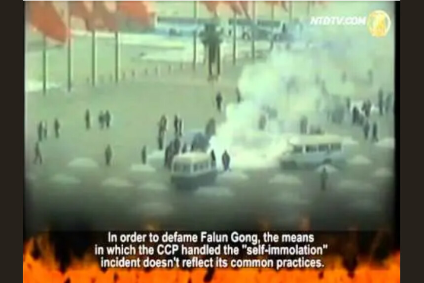 Captura de pantalla del reportaje de NTDTV sobre las "autoinmolaciones" escenificadas en la plaza de Tiananmen, en Beijing (China), el 23 de enero de 2001. (Captura de pantalla/NTD).Mientras tanto, Leatham le preguntó al hombre dónde había encontrado la foto, y este señaló a una mujer sentada cerca, afuera del McDonald's del centro comercial Cavill, indicando que era su esposa.