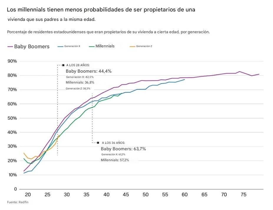 Mientras tanto, los mayores de la generación Z, nacidos entre 1997 y 2012, solo tienen 28 años. En 2025, el 38.3 % de estos jóvenes de 28 años era propietario de una vivienda. Esto contrasta con el 42.5 % de la generación X y el 44.4 % de los baby boomers a la misma edad, según el informe de Redfin. Sin embargo, es superior a la tasa de los millennials, que era del 36.8 % a los 28 años.