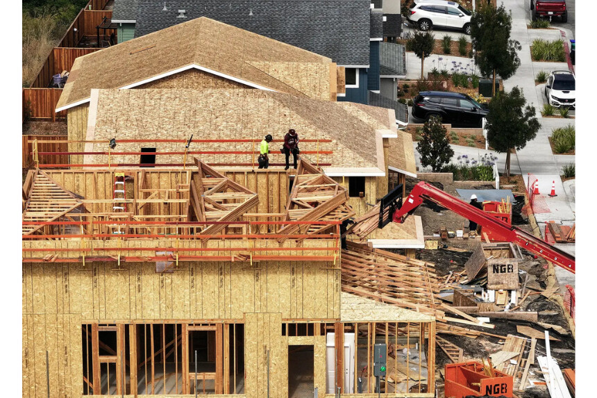 Los trabajadores de la construcción construyen una casa en un nuevo desarrollo de viviendas en Hércules, California, el 1 de julio de 2025. (Justin Sullivan/Getty Images)En cifras