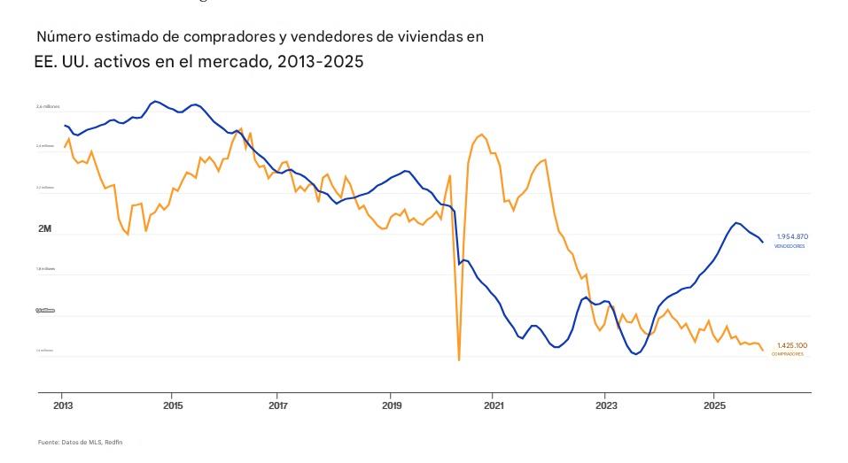 Pero con la ralentización del crecimiento, el número de compradores de vivienda en EE. UU. en noviembre de 2025 cayó a 1.43 millones, su nivel más bajo registrado, aparte del de abril de 2020, cuando la COVID-19 paralizó el mercado.