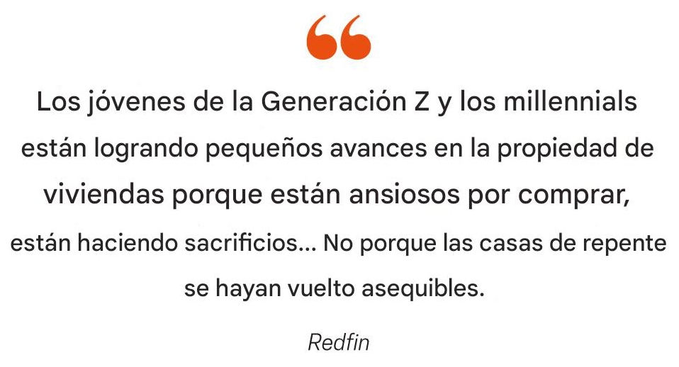 Si bien las tasas de propiedad de vivienda se mantuvieron estables en 2024, para la Generación Z y los millennials, un análisis de enero mostró que las tasas de propiedad de vivienda para ambos grupos aumentaron de 2024 a 2025. La Generación Z subió del 26.1 % al 27.1 % y los millennials del 54.9 % al 55.4 %. Redfin califica los aumentos de "significativos".