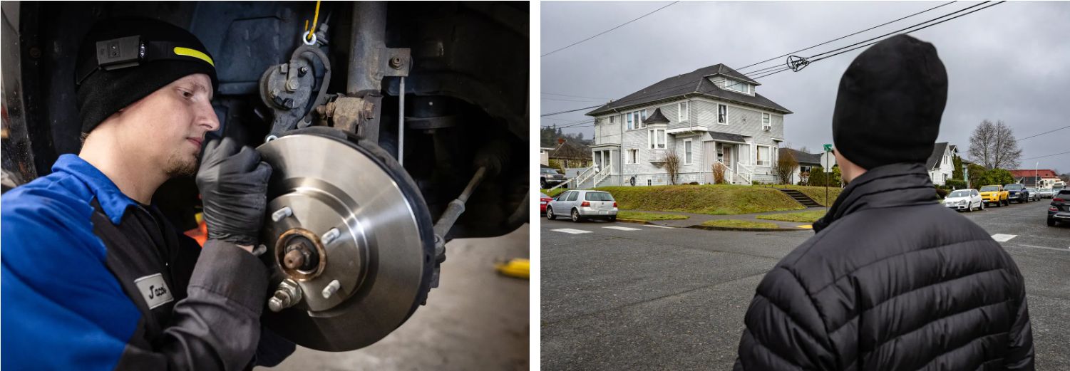 (Arriba, abajo a la derecha) Jacob Weber, veterano del ejército estadounidense de 30 años, busca casa en Aberdeen, Washington, el 30 de enero de 2026. Weber, quien alquiló la propiedad de un familiar desde que terminó su servicio en 2022, dijo que el aumento del costo de vida y los altos alquileres le hicieron cada vez más difícil ahorrar para una vivienda. (Abajo a la izquierda) Jacob Weber repara los frenos de un vehículo en Aberdeen, Washington, el 30 de enero de 2026. (John Fredricks/The Epoch Times)Años después, se siente estancado, dijo.