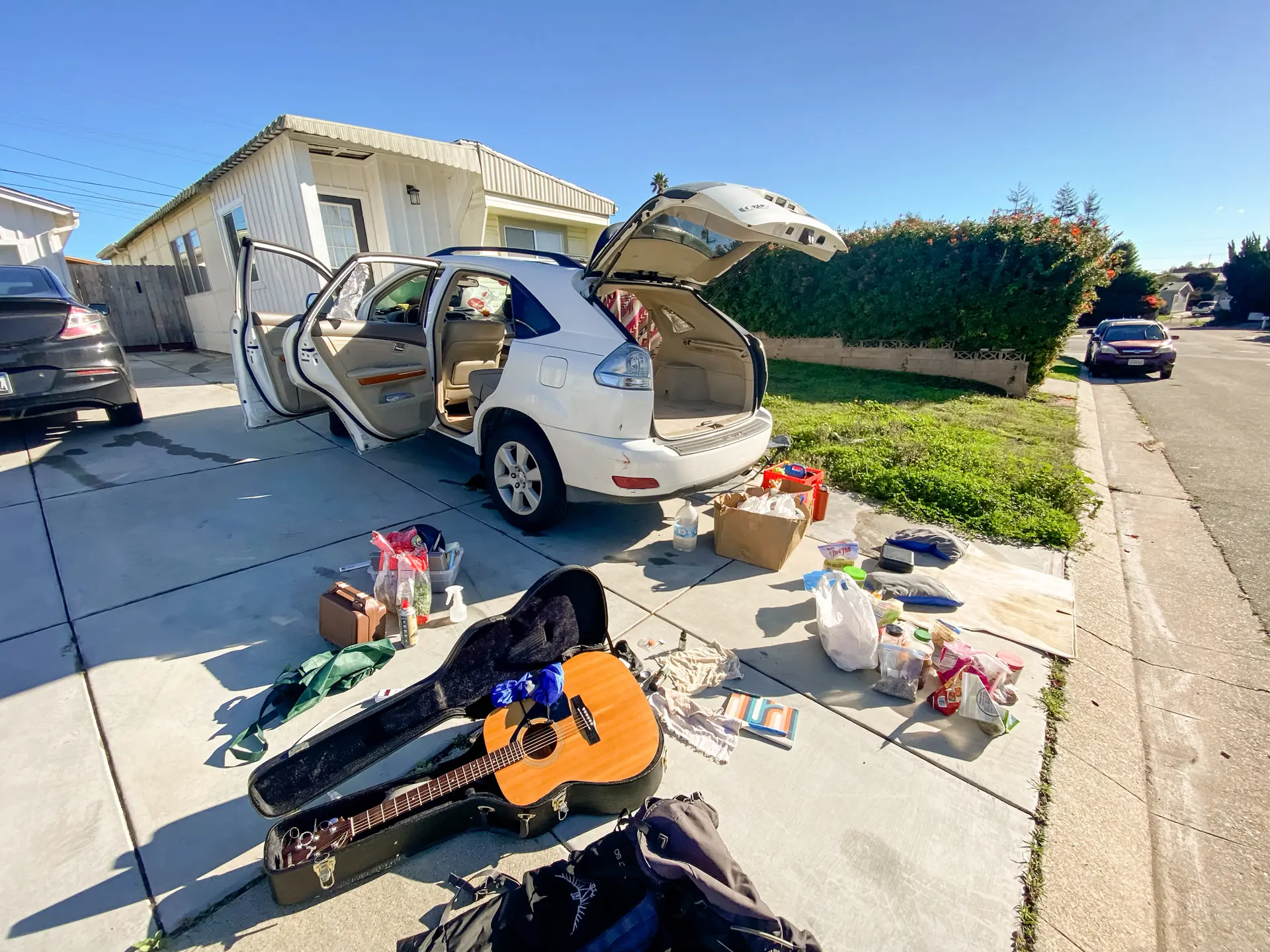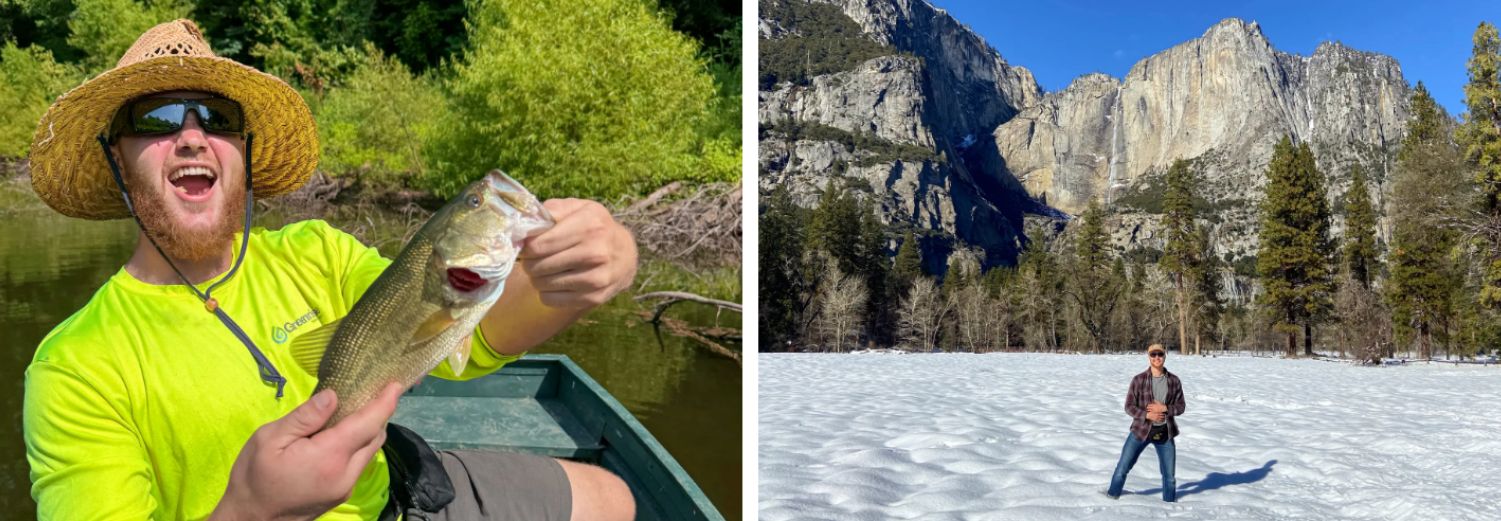 (Arriba) El auto de David Moore, llamado "Tuco" donde vivió mientras viajaba por todo el país varias veces, se muestra en Nipomo, California, el 23 de enero de 2024. (Abajo) Moore sostiene una lobina negra en Kentucky el 12 de julio de 2025. (Abajo a la derecha) Moore visita el Parque Nacional Yosemite durante un viaje de trabajo en Yosemite, California, el 14 de enero de 2024. (Cortesía de David Moore)Ser creativo