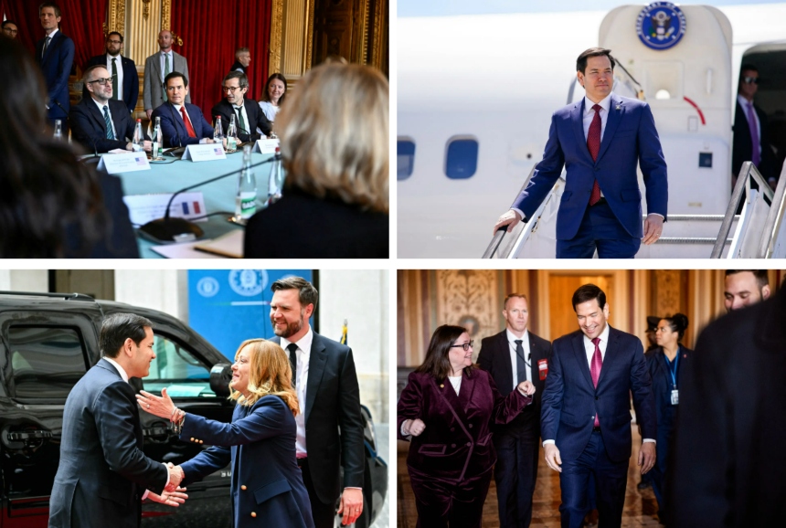 (Arriba a la izquierda) El secretario de Estado Marco Rubio (C), el director político del Ministerio de Asuntos Exteriores de Alemania, Gunter Sautter (2.º por la derecha), y funcionarios de otros países participan en una reunión en París, el 17 de abril de 2025. (Arriba a la derecha) El secretario de Estado Marco Rubio desembarca de un avión en el Aeropuerto Internacional Norman Manley de Port Royal, Jamaica, el 26 de marzo de 2025. (Abajo a la izquierda) La primera ministra italiana Giorgia Meloni (C) da la bienvenida al vicepresidente JD Vance (D) y al secretario de Estado Marco Rubio en el Palazzo Chigi de Roma, el 18 de mayo de 2025. (Abajo a la derecha) El secretario de Estado Marco Rubio habla con un miembro del personal del Senado mientras se dirige a una reunión a puerta cerrada con legisladores en el Capitolio, en Washington, el 16 de diciembre de 2025. (Julien De Rosa/POOL/AFP a través de Getty Images, Nathan Howard/POOL/AFP a través de Getty Images, Alberto Pizzoli/AFP a través de Getty Images, Andrew Harnik/Getty Images)"El régimen de Maduro es una organización criminal que trafica con drogas en nuestras calles, está provocando una peligrosa crisis migratoria y ha invitado a Putin a abrir bases militares".