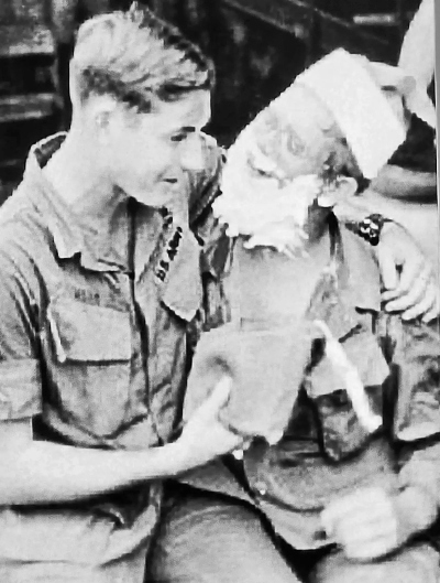 Tim Connaghan (derecha) posa como Papá Noel mientras estaba destinado en Vietnam el 23 de diciembre de 1969. Se puso el traje por primera vez para repartir bolsas de regalos navideños de la Cruz Roja y, desde entonces, ha pasado más de 50 años perfeccionando el papel. (Cortesía de Tim Connaghan)Un soldado tuvo una idea creativa para la ocasión festiva. Se aplicó crema de afeitar Barbasol en la cara, se puso un gorro rojo y posó para las fotos con las tropas.