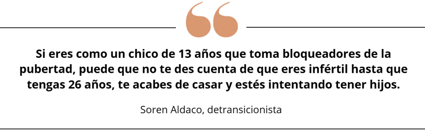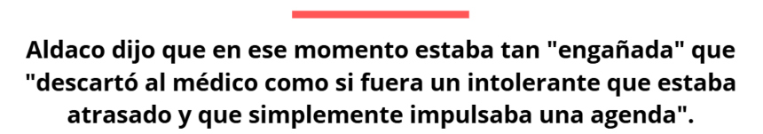 Uno de esos especialistas sugirió que las hormonas podrían ser las culpables, pero Aldaco dijo que en ese momento estaba tan "desorientada" que "descartó al médico como un intolerante anticuado que solo buscaba promover su agenda".