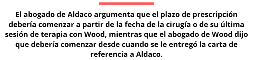 Aldaco ha alegado que su terapeuta, Barbara Rose Wood, cometió fraude y negligencia cuando firmó una carta de derivación en febrero de 2021 en la que aprobaba una doble mastectomía, también conocida como "cirugía superior". Al igual que otras personas en su situación, Aldaco se topó con un plazo de prescripción que podría invalidar su demanda, dependiendo de cómo interprete el tribunal la ley estatal.La próxima decisión del tribunal depende de cuándo los nueve jueces consideren que comenzó a correr el plazo de prescripción, que en Texas es de dos años. La ley estatal establece que las demandas deben "presentarse en un plazo de dos años a partir de la ocurrencia" de la presunta infracción, o desde el momento en que se completó el tratamiento médico en cuestión.