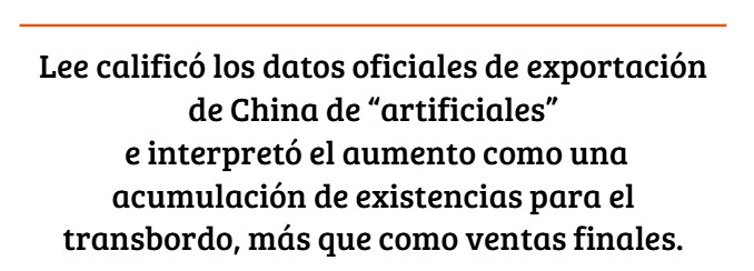 Lee calificó los datos oficiales de exportación de China de “artificiales” e interpretó el aumento como una acumulación de existencias para el transbordo, más que como ventas finales. En otras palabras, es posible que esos productos hayan cruzado las fronteras de China, pero que aún se encuentren en tránsito, a la espera de compradores finales.