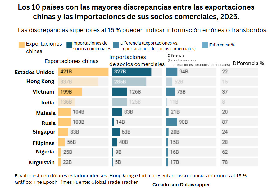 Contenedores y grúas en el puerto de aguas profundas de Yangshan, cerca de Shanghái, el 3 de junio de 2025. El Rhodium Group estimó que el comercio exterior representó más de la mitad del aumento de la producción económica total de China el año pasado. (Héctor Retamal/AFP vía Getty Images).En principio, las exportaciones de un país deberían coincidir con las importaciones de sus socios comerciales. En la práctica, es habitual que se produzcan pequeñas discrepancias, ya que las exportaciones se registran de forma diferente a las importaciones. Según las Naciones Unidas y la Organización para la Cooperación y el Desarrollo Económicos, estos factores suelen explicar una diferencia de entre el 5 % y el 10 %. Las diferencias superiores al 15 % pueden indicar un registro erróneo o un transbordo a través de terceros países.