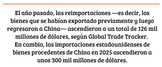El año pasado, las reimportaciones —es decir, los bienes que se habían exportado previamente y luego regresaron a China— ascendieron a un total de 126 mil millones de dólares, según Global Trade Tracker. En cambio, las importaciones estadounidenses de bienes procedentes de China en 2025 ascendieron a unos 300 mil millones de dólares.