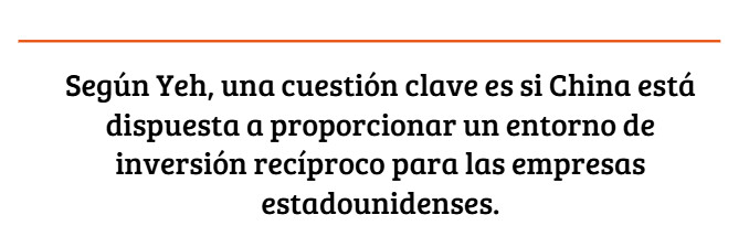 Según Yeh, una cuestión clave es si China está dispuesta a ofrecer un entorno de inversión recíproco a las empresas estadounidenses.