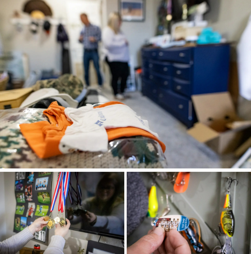 (Arriba) Ropa de bebé perteneciente al difunto Evan Boettler yace sobre su cama en Aurora, Misuri, el 23 de marzo de 2026. (Abajo a la izquierda) Kari Boettler observa las medallas ganadas por su hijo en Aurora, Misuri, el 23 de marzo de 2026. (Abajo a la derecha) Un señuelo de pesca con el equipo de baloncesto juvenil de Evan Boettler cuelga de la pared de su habitación en Aurora, Misuri, el 23 de marzo de 2026. (John Fredricks/The Epoch Times)Evan fue víctima de "sextorsión". En la sextorsión, un depredador online convence a su víctima menor de edad para que intercambie fotos o vídeos sexualmente explícitos, conocidos como material de abuso sexual infantil (CSAM).