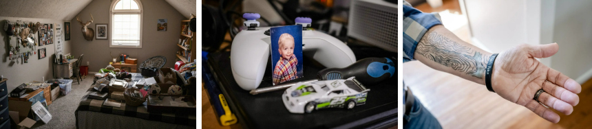 (Izquierda) Se muestra el dormitorio del difunto Evan Boettler en Aurora, Misuri, el 23 de marzo de 2026. (Centro) Una foto de Evan Boettler de niño junto a su mando de videojuegos en su casa de Aurora, Misuri, el 23 de marzo de 2026. (Derecha) Brad Boettler, el padre de Evan, muestra un tatuaje que representa un espacio al aire libre al que solía ir con su hijo, en Aurora, Misuri, el 23 de marzo de 2026. (John Fredricks/The Epoch Times)"A veces ocurre rápidamente, otras veces se desarrolla a lo largo de un periodo de tiempo", explicó Kehoe a The Epoch Times. "Una vez que consiguen esa [confianza], empiezan a utilizar esa información, esas imágenes, para extorsionar a estas personas, a estas víctimas, y obligarlas a hacer todo tipo de cosas".