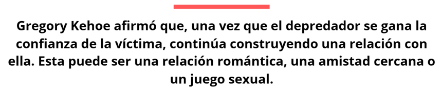 Afirmó que, una vez que el depredador se ha ganado esa confianza, continúa construyendo una relación con la víctima. Esta puede ser una relación romántica, una amistad íntima o un juego sexual.