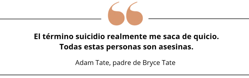 "El término 'suicidio' realmente me molesta", dijo Tate. "Todas estas personas son asesinas".