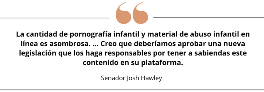 "La cantidad de pornografía infantil y material de abuso infantil online es abrumadora", declaró Hawley a The Epoch Times. "No lo retiran de sus plataformas. Creo que deberían ser procesados. Creo que deberíamos aprobar una nueva legislación que les haga responsables por tener a sabiendas este contenido en su plataforma".