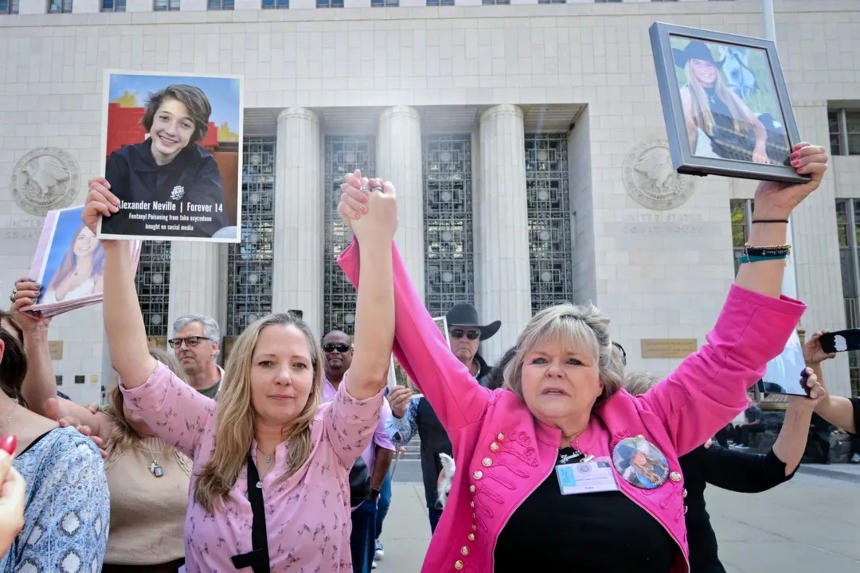 Los familiares de las víctimas que fallecieron tras tomar pastillas adulteradas con drogas compradas en las redes sociales, entre ellos Lori Schott (derecha) y Amy Neville (izquierda), abandonan la Corte Superior de Los Ángeles con retratos de sus hijos en Los Ángeles, el 25 de marzo de 2026. (Frederic J. Brown/AFP vía Getty Images)El fiscal general de Nuevo México, Raúl Torrez, presentó la demanda después de que varios adultos enviaran material de abuso sexual infantil (CSAM) a agentes encubiertos que se hacían pasar por niños.