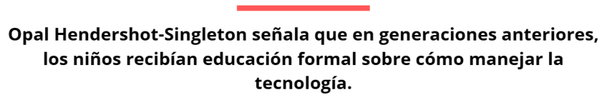 Opal Singleton Hendershot es autora y conferenciante sobre seguridad online. Señaló que, en generaciones anteriores, se educaba formalmente a los niños sobre cómo manejar tanto la tecnología como las amenazas a su seguridad.