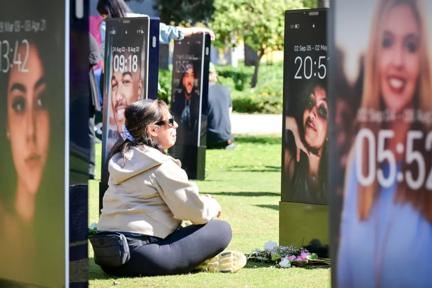 Padres afligidos contemplan las imágenes de sus hijos fallecidos expuestas en el Lost Screen Memorial, una instalación artística de teléfonos inteligentes a gran escala que muestra a 50 niños que perdieron la vida a causa de daños online, en Los Ángeles, el 13 de febrero de 2026. (Frederic J. Brown/AFP vía Getty Images)Tate dijo que está difundiendo la historia de su hijo para evitar futuras tragedias. Afirmó que cree que salvar a otros niños es un tributo adecuado a su Bryce.
