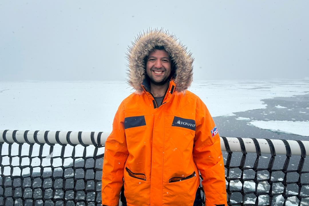 Eric Herrera, director ejecutivo de MaverickX, en una expedición de investigación en la Antártida el 9 de diciembre de 2025. La empresa de Herrera está desarrollando métodos para recuperar más metal de los minerales y residuos existentes, extrayendo todo el valor posible de las rocas y los aparatos electrónicos desechados. (Cortesía de MaverickX)