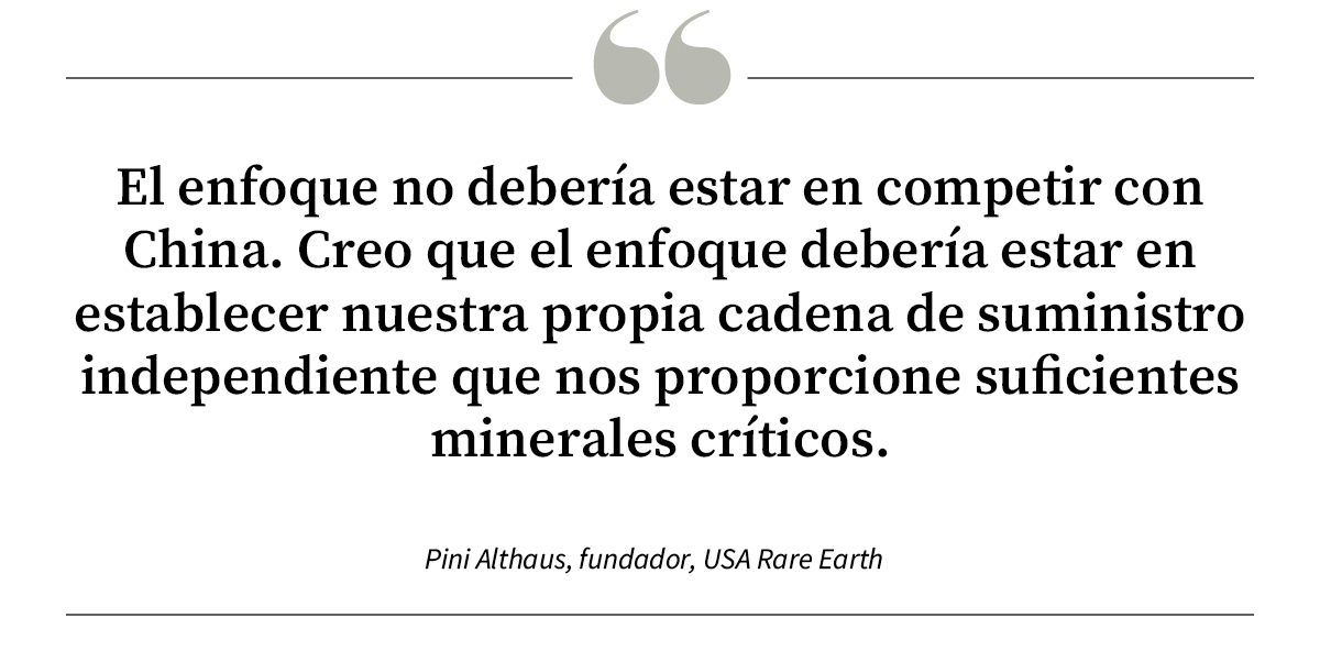 Los principales actores dijeron que la tecnología es una pieza del rompecabezas para reconstruir la cadena de suministro.Pini Althaus, fundador de USA Rare Earth y ahora presidente de Cove Capital, dijo que el dominio de China sobre los minerales críticos se construyó a lo largo de "varias décadas" mediante inversiones coordinadas, subsidios de amplio espectro y la voluntad de ignorar los costos ambientales.