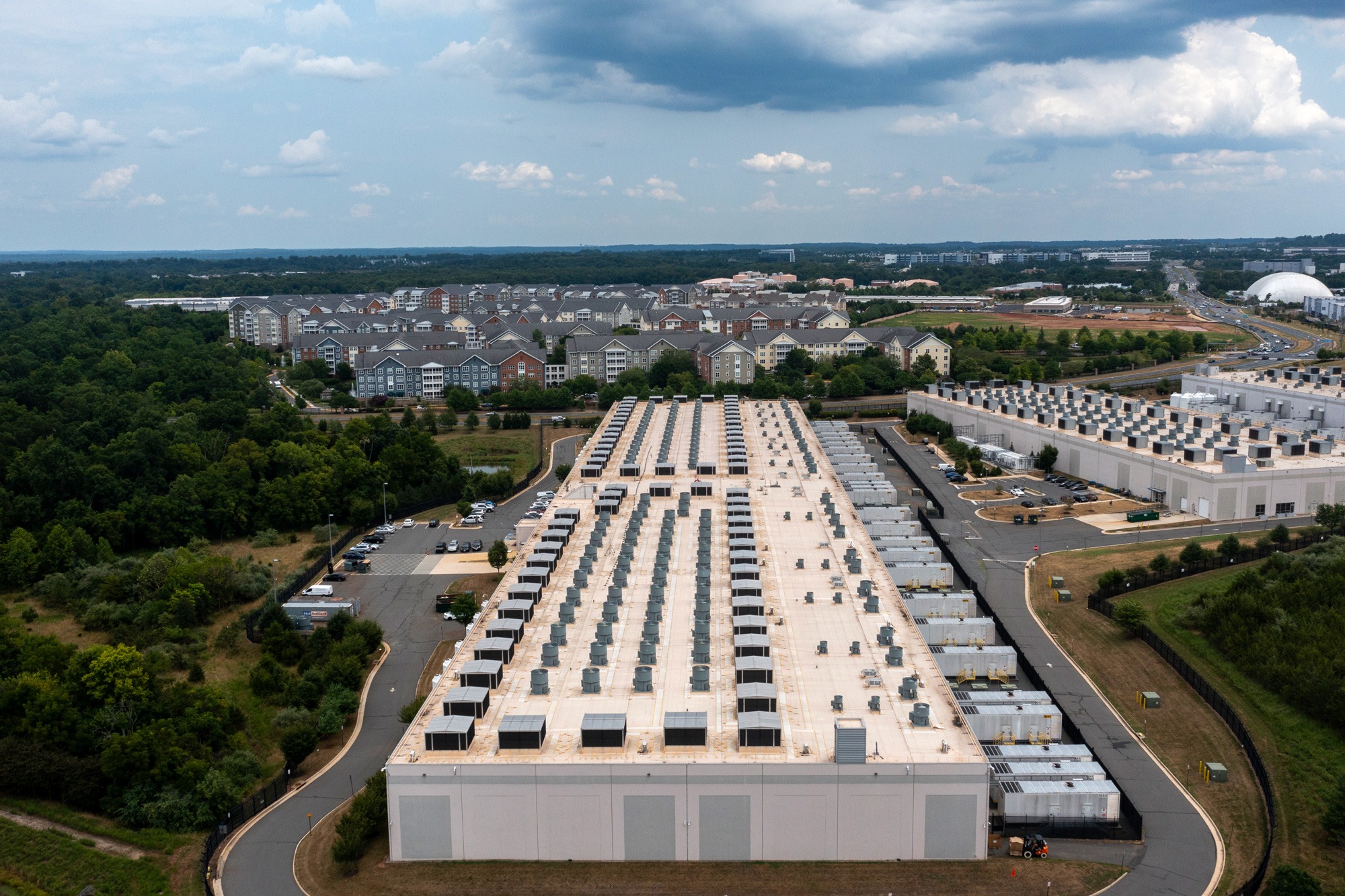 Panorámica aérea del centro de datos IAD71 de Amazon Web Services en Ashburn, Virginia, el 17 de julio de 2024. (Nathan Howard/Getty Images).Aspectos destacados de la medalla