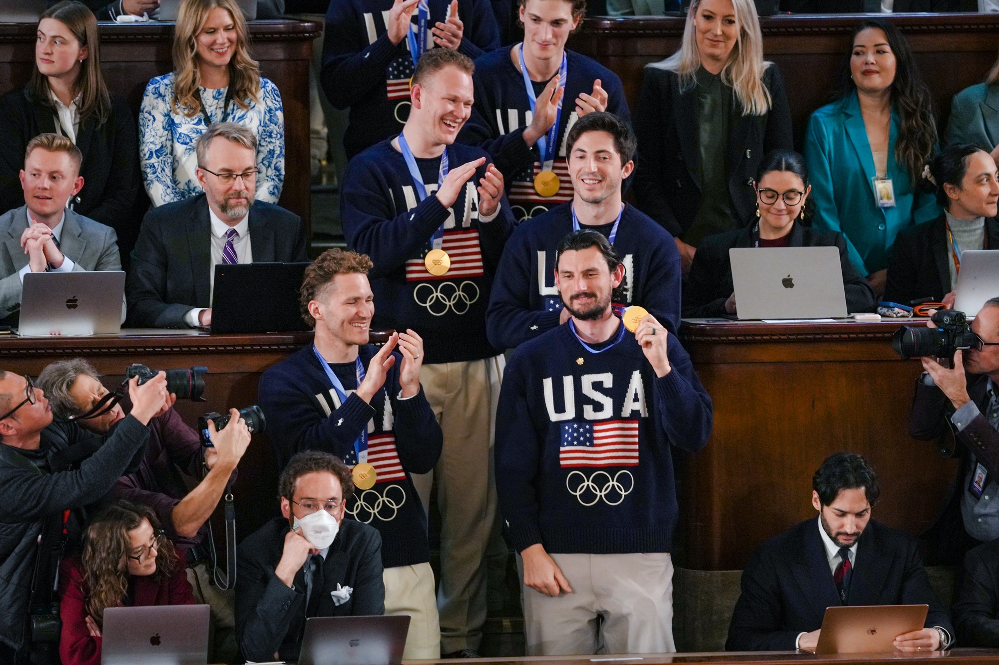 Connor Hellebuyck (centro derecha), portero del equipo olímpico masculino de hockey de Estados Unidos, y otros miembros del equipo asisten al primer discurso sobre el estado de la Unión del presidente Donald Trump durante su segundo mandato presidencial, en la Cámara de Representantes del Capitolio, en Washington, el 24 de febrero de 2026. (Madalina Kilroy/The Epoch Times).A continuación, el presidente otorgó la Legión del Mérito al nadador de rescate de la Guardia Costera de Estados Unidos Scott Ruskan, quien ayudó a rescatar a 165 personas durante las inundaciones repentinas en Texas el verano pasado.