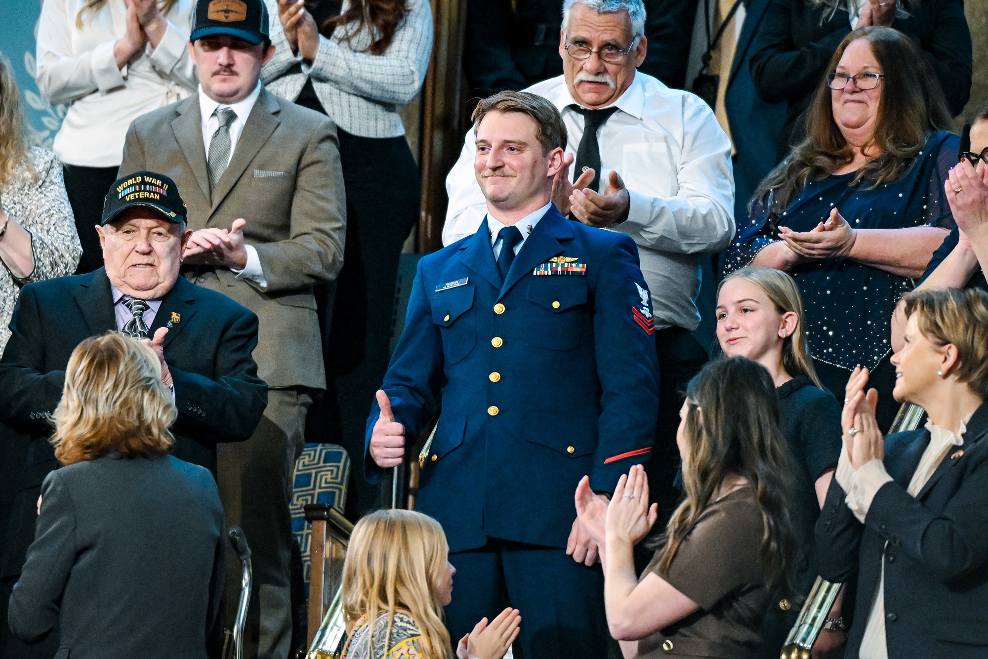 El suboficial de la Guardia Costera de los Estados Unidos Scott Ruskan y una campista, Milly Cate, a quien rescató durante las inundaciones en Camp Mystic, asisten al discurso sobre el estado de la Unión del presidente Donald Trump en el Capitolio de los Estados Unidos el 24 de febrero de 2026. (Kenny Holston-Pool/Getty Images).Trump destacó la incursión de las operaciones especiales estadounidenses del 3 de enero para capturar al líder venezolano Nicolás Maduro. Atribuyó gran parte de su éxito al suboficial jefe del Ejército, Eric Slover, quien continuó pilotando uno de los helicópteros de la fuerza de ataque a pesar de ser alcanzado por fuego enemigo.