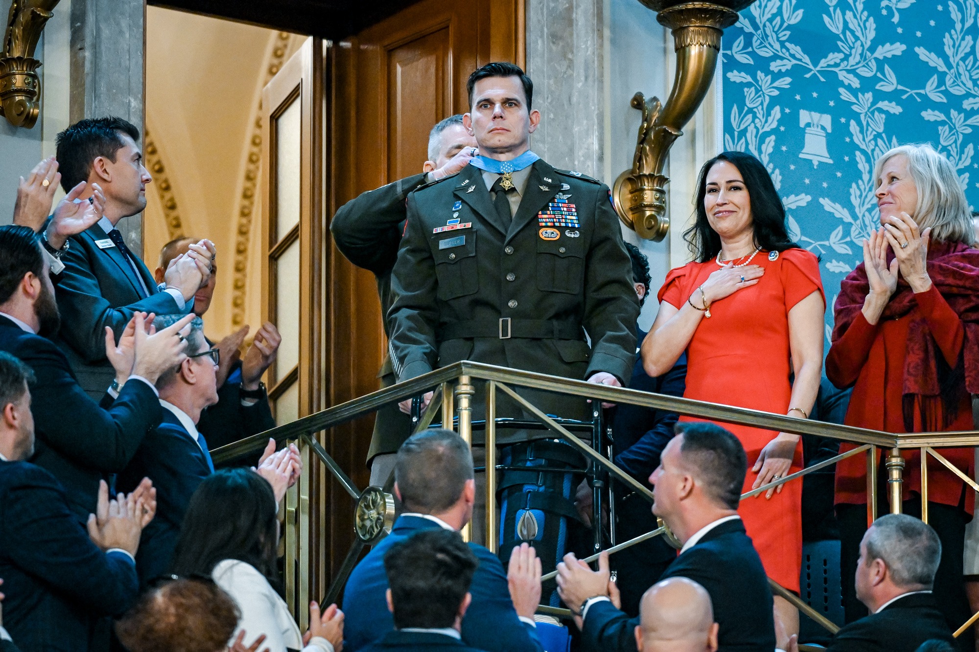 El suboficial mayor del Ejército de los Estados Unidos Eric Slover recibe la Medalla de Honor mientras el presidente Donald Trump pronuncia el discurso sobre el estado de la Unión durante una sesión conjunta del Congreso en el Capitolio de los Estados Unidos el 24 de febrero de 2026. (Kenny Holston-Pool/Getty Images).Trump otorgó a Slover la Medalla de Honor, la primera vez en la historia que la máxima condecoración militar al valor se otorga durante un discurso sobre el Estado de la Unión.