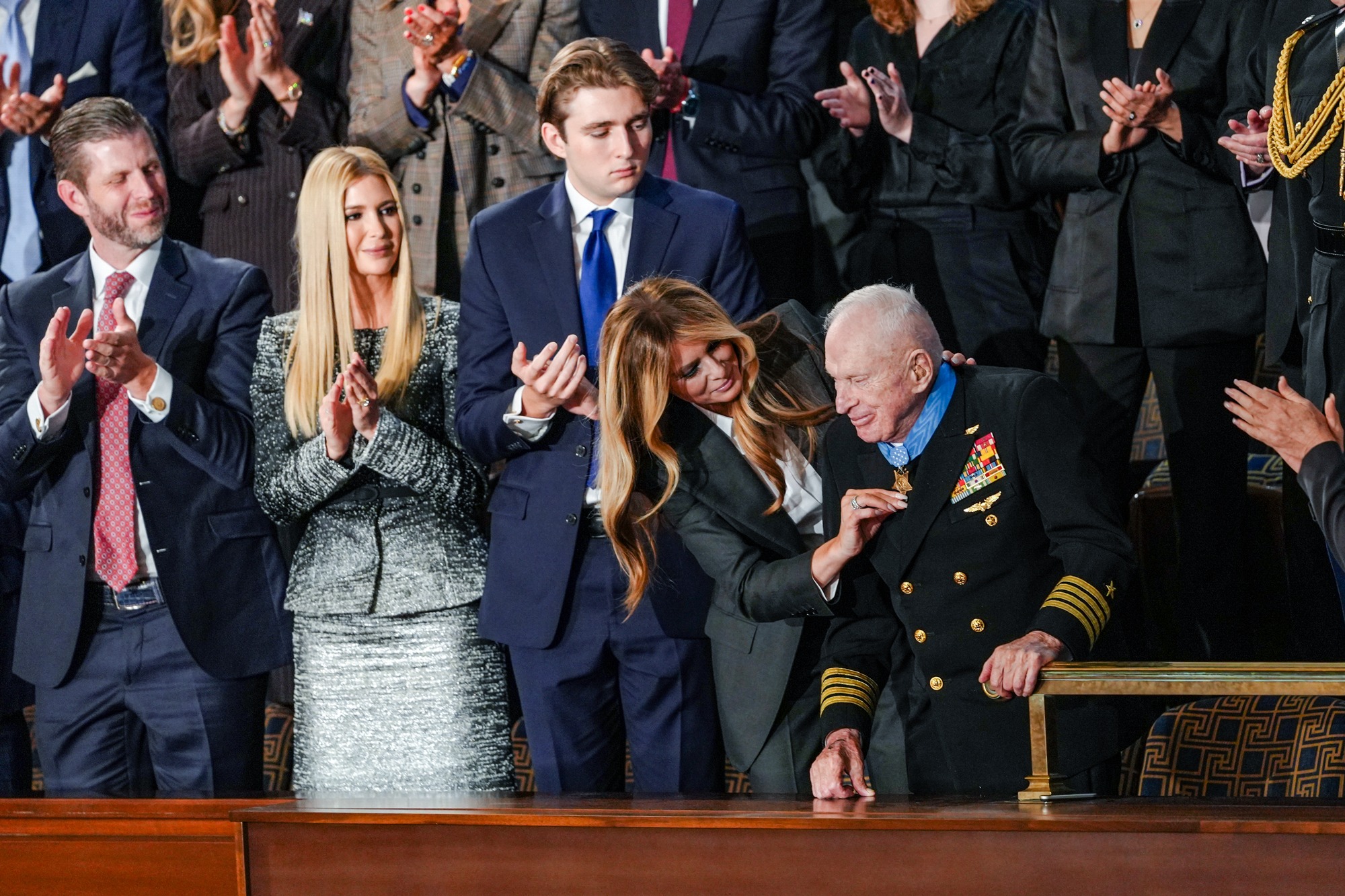 El capitán retirado de la Marina de los Estados Unidos E. Royce Williams recibe la Medalla de Honor de manos de la primera dama Melania Trump durante el primer discurso sobre el estado de la Unión del presidente Donald Trump en su segundo mandato presidencial en el Capitolio, en Washington, el 24 de febrero de 2026. (Madalina Kilroy/The Epoch Times).Los demócratas se abstienen de aplaudir