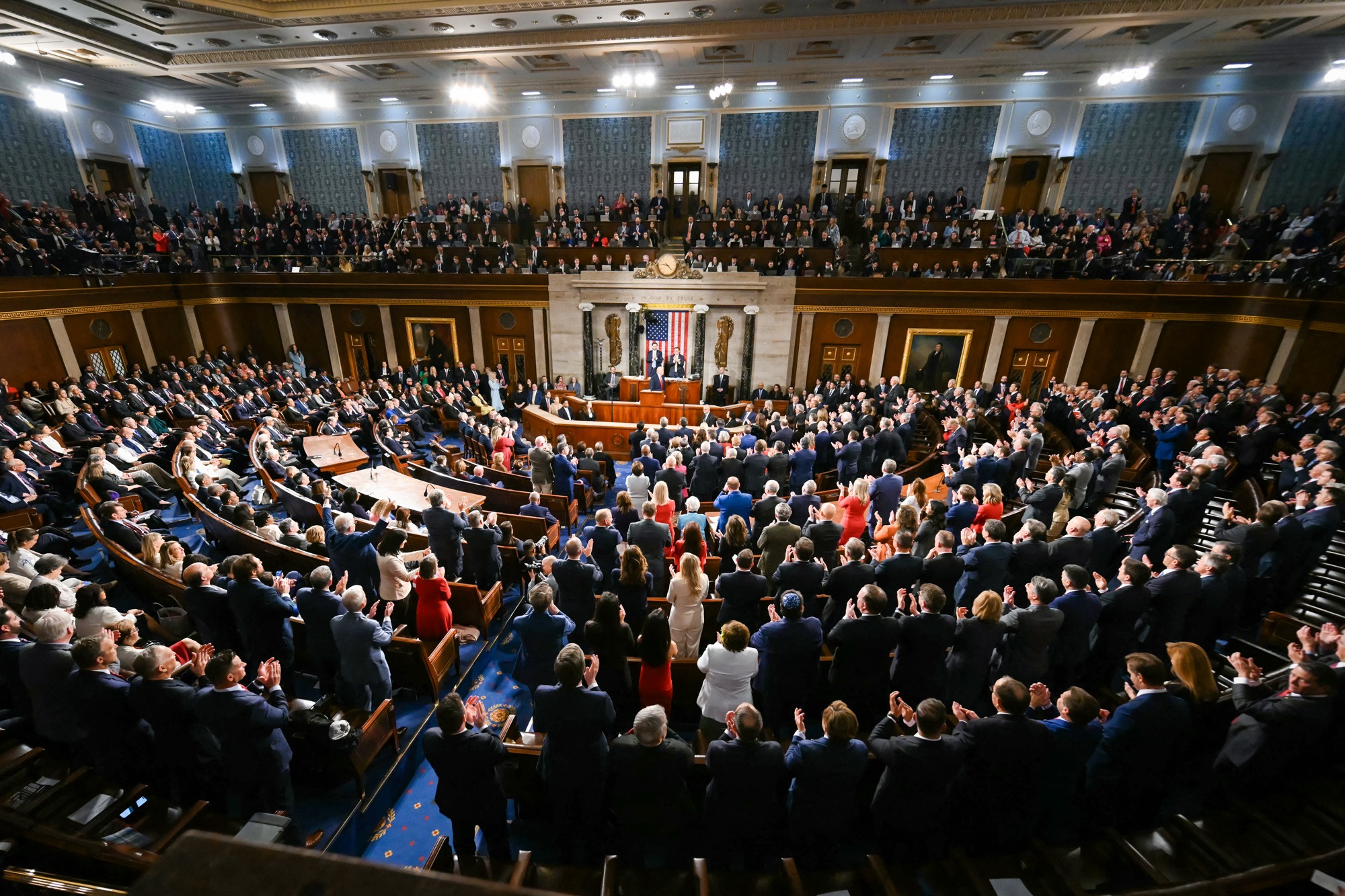 Los republicanos se ponen de pie para aplaudir durante el discurso sobre el estado de la Unión del presidente Donald Trump en la Cámara de Representantes del Capitolio de los Estados Unidos el 24 de febrero de 2026. (Andrew Caballero-Reynolds/AFP a través de Getty Images).Invitados destacan la agenda económica