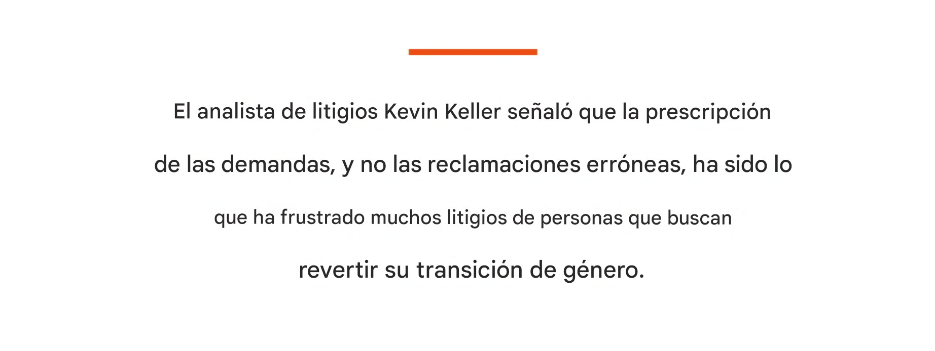 El analista de litigios Kevin Keller señaló que el plazo de prescripción de los delitos —y no las reclamaciones infundadas— ha sido lo que ha acabado con muchas de esas demandas de personas que han abandonado su transición de género. Públicamente ha afirmado que ningún caso se ha desestimado por carecer de fundamento.
