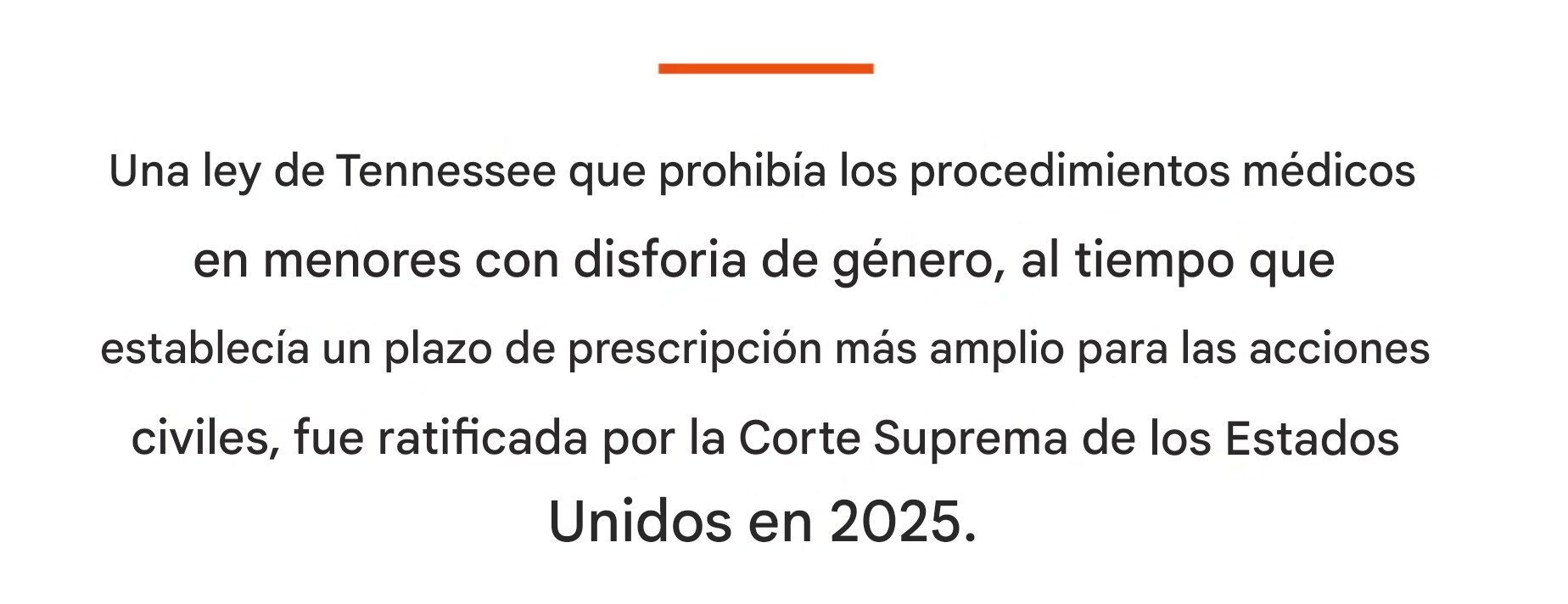 La ley SB 1 de Tennessee, que entró en vigor en 2023, prohibió los procedimientos médicos en menores con disforia de género, pero también estableció un plazo de prescripción más amplio para las acciones civiles, que se extiende 30 años a partir de la fecha en que el menor cumple 18 años, o 10 años después de la muerte del menor si fallece antes.Las disposiciones de la ley que prohíben la transición de género en menores fueron ratificadas por la Corte Suprema de Estados Unidos en el caso Estados Unidos contra Skrmetti en 2025. El fallo confirmó su constitucionalidad, permitiendo que las medidas de ejecución, como las disposiciones sobre responsabilidad civil, permanezcan vigentes. La ley de Tennessee es una de las más exhaustivas al establecer un recurso civil con un plazo de prescripción prolongado.