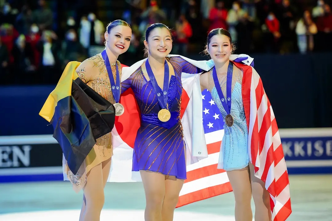 La medallista de oro Kaori Sakamoto, de Japón (C), la medallista de plata Loena Hendrickx, de Bélgica (I), y la medallista de bronce Alysa Liu, de Estados Unidos (D), posan durante la ceremonia de entrega de medallas tras la prueba de patinaje libre femenino en el Campeonato Mundial de Patinaje Artístico de la ISU en Montpellier, Francia, el 25 de marzo de 2022. (Sylvain Thomas/AFP vía Getty Images)"Solo podemos suponer lo que pasó", dijo. Especuló que el régimen podría haber borrado las pruebas para encubrir el asunto.