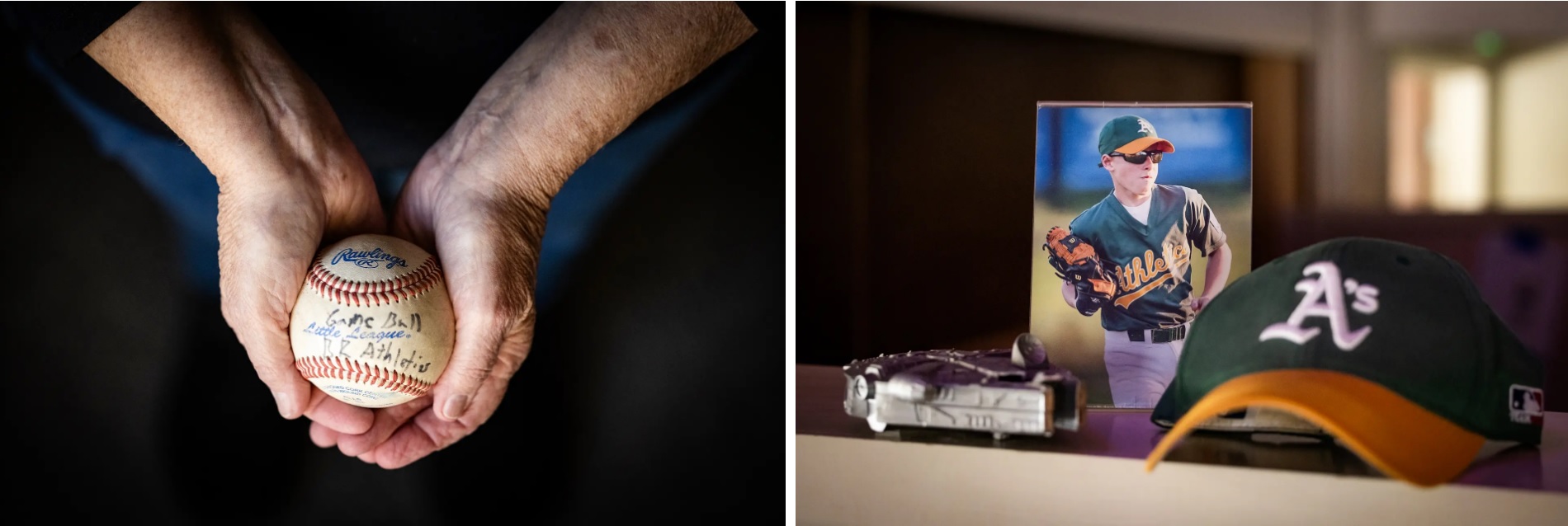 (Izquierda) Judy Rogg sostiene una de las pelotas de béisbol utilizadas y escritas por su hijo fallecido Erik en Los Ángeles el 15 de abril de 2026. (Derecha) Una foto de Erik Robinson junto a artículos que poseía en Los Ángeles el 15 de abril de 2026. (John Fredricks/The Epoch Time)"A los 12 años, con 36 kilos de peso empapado y vestido, era capaz de hacer una docena de dominadas. Trabajaba para alcanzar sus metas", dijo.