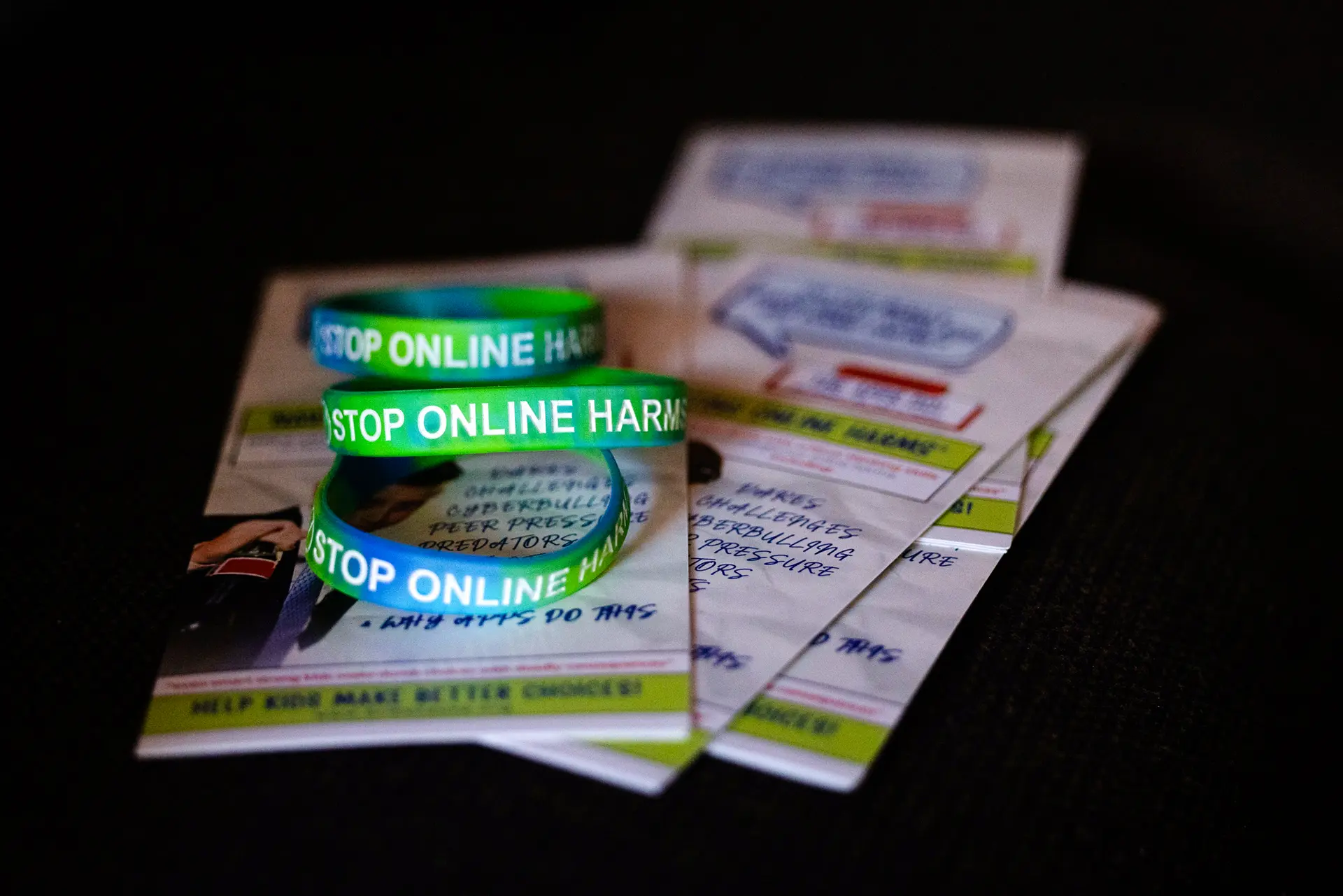 La lectura de pulseras “Stop Online Harm” promueve el mensaje de Erik's Cause, una organización sin fines de lucro que lleva el nombre del hijo de Rogg, Erik, en Los Ángeles el 15 de abril de 2026. (John Fredricks/The Epoch Times)Culpar a los padres