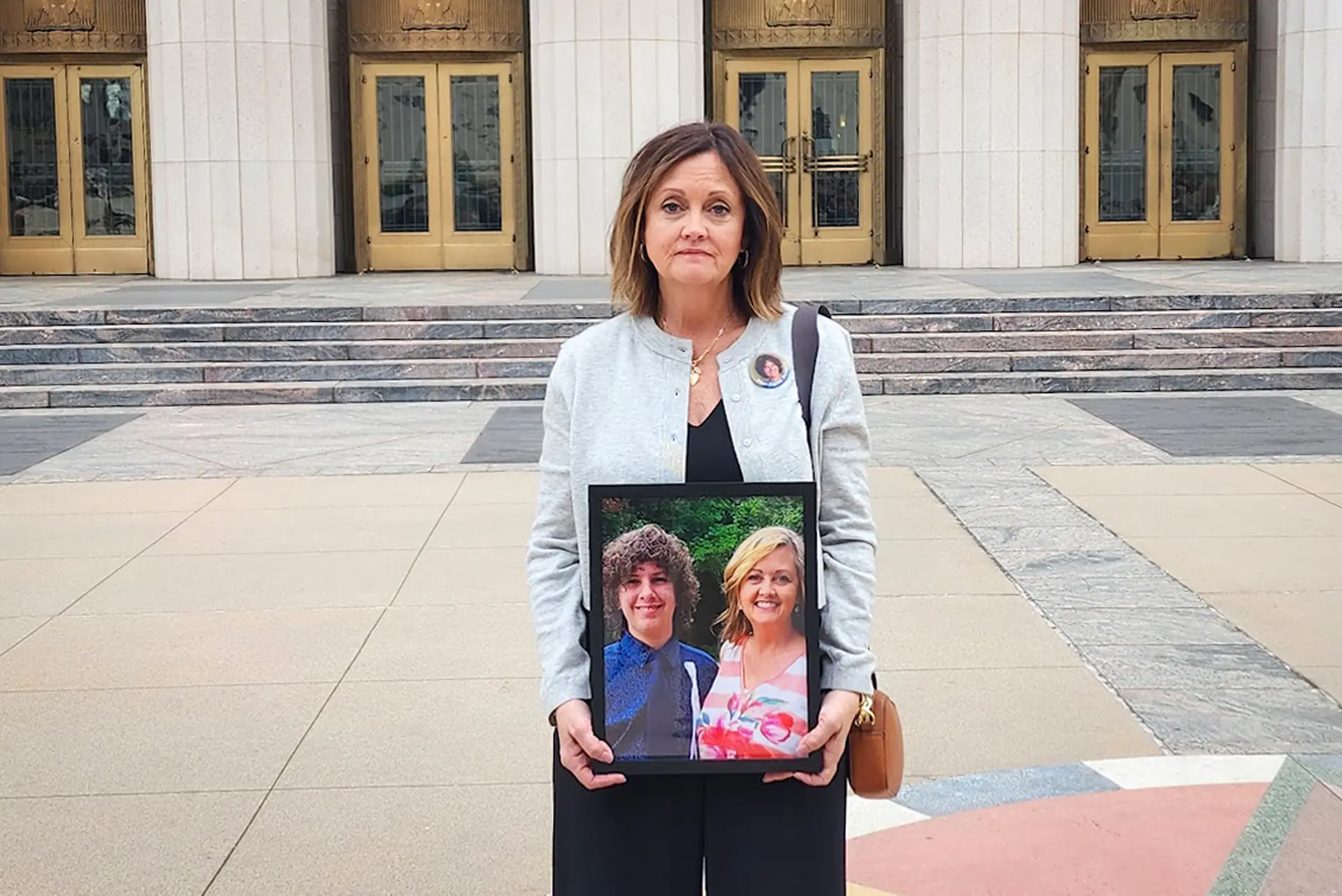 Joann Bogard sostiene una foto de ella con su hijo, Mason, en el Tribunal Superior de Los Ángeles el 5 de febrero de 2026. Mason murió a los 15 años en 2019 después de intentar un desafío viral “de asfixia” en YouTube. (Cortesía de Joann Bogard)Seguridad infantil frente a libertad de expresión