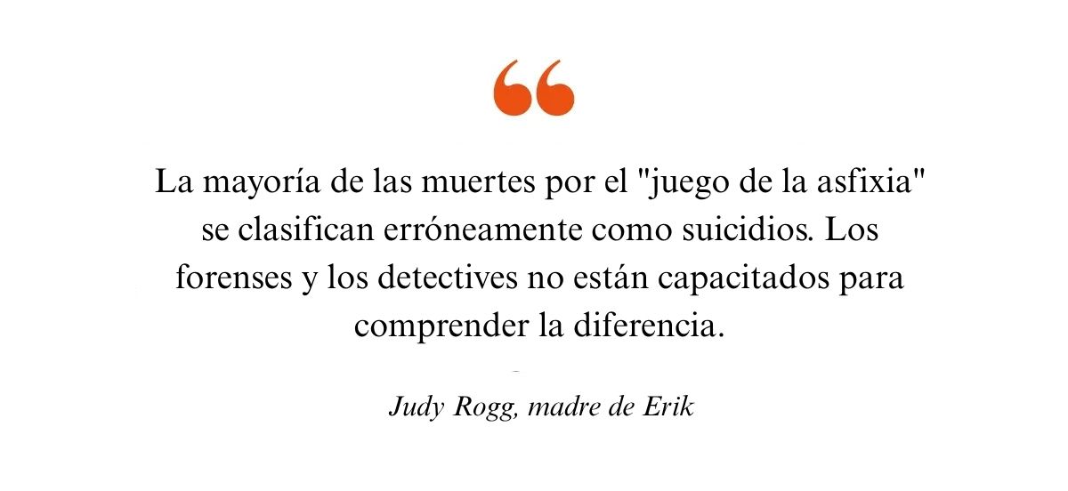 "La mayoría de las muertes por el juego de la asfixia se clasifican erróneamente como suicidios. Los forenses y los detectives no están capacitados para entender la diferencia. Entran, les parece un suicidio, marcan una casilla y se van", dijo, señalando que a los padres a menudo les cuesta cambiar el certificado de defunción a posteriori. "Esto deja a los padres en una doble encrucijada: '¿Qué señales no vi? ¿Qué mal padre soy?'. No eran malos padres. Es solo que no había nadie a quien hablarle de ello".