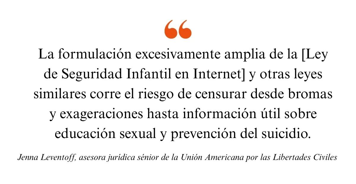 "El lenguaje excesivamente amplio de la KOSA y de legislaciones similares corre el riesgo de censurar todo, desde chistes y exageraciones hasta información útil sobre educación sexual y prevención del suicidio", dijo Jenna Leventoff, asesora jurídica sénior de la Unión Americana por las Libertades Civiles, en una declaración el año pasado.