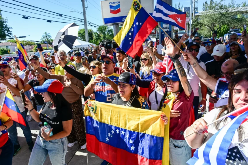 Personas reaccionan ante la noticia de la captura del líder venezolano Nicolás Maduro, tras las acciones militares de EE. UU. en Venezuela, en Doral, Florida, el 3 de enero de 2026. (Giorgio Viera/AFP vía Getty Images)Algunos expatriados venezolanos celebraron la noticia de la captura de Maduro en Doral, Florida, hogar de la comunidad más grande de inmigrantes venezolanos en los Estados Unidos.