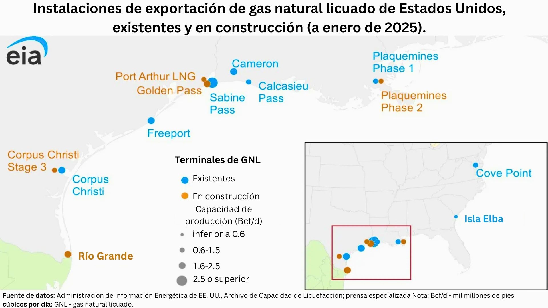 Hay ocho terminales de exportación de GNL en Estados Unidos, todas ellas situadas en el Golfo de México y la costa este: cuatro en Luisiana, dos en Texas y una en Georgia y otra en Maryland. Una novena —la terminal Golden Pass de ExxonMobil, situada en el lado texano de Sabine Pass— comenzó a licuar gas natural en febrero y empezará a realizar envíos en breve.