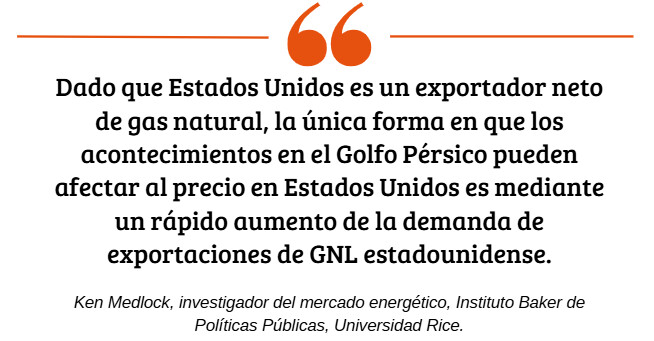 Medlock señaló: “Puede parecer contradictorio, pero dado que Estados Unidos es un exportador neto de gas natural, la única forma en que los acontecimientos en el Golfo Pérsico pueden afectar al precio en Estados Unidos es mediante un rápido aumento de la demanda de exportaciones de GNL estadounidense”.