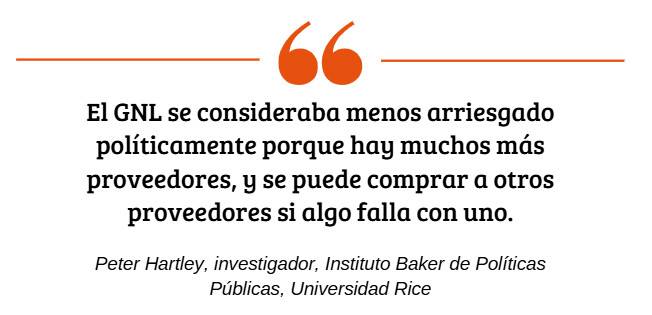 “El GNL se consideraba menos arriesgado políticamente porque hay muchos más proveedores, y se puede comprar a otros proveedores si algo falla con uno”, afirmó Hartley, quien ha visitado las instalaciones de GNL de Catar.