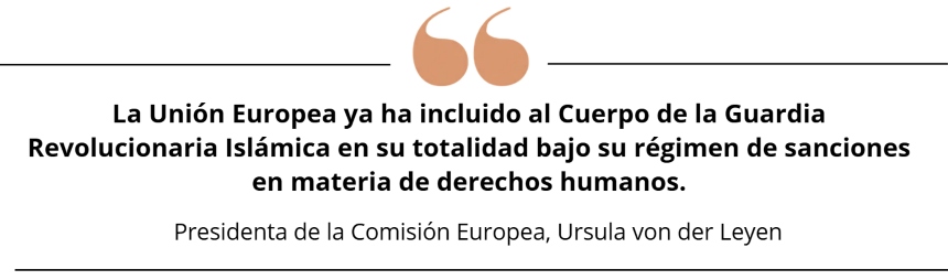 "La Unión Europea ya incluyó al Cuerpo de la Guardia Revolucionaria Islámica en su totalidad en su régimen de sanciones por violaciones a los derechos humanos", afirmó Von der Leyen.