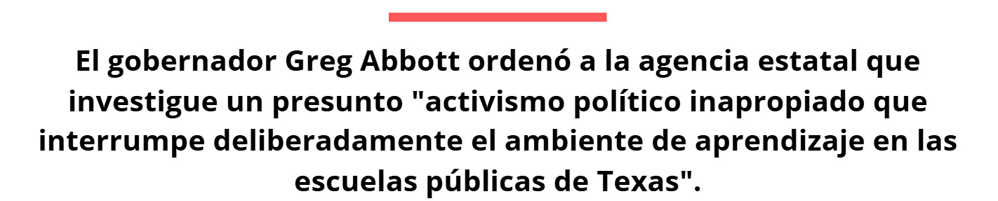 La medida de Texas se produjo tras la orden del gobernador de Texas, Greg Abbott, a la agencia de investigar el supuesto "activismo político inapropiado que perturba deliberadamente el entorno de aprendizaje en las escuelas públicas de Texas", según el comunicado.
